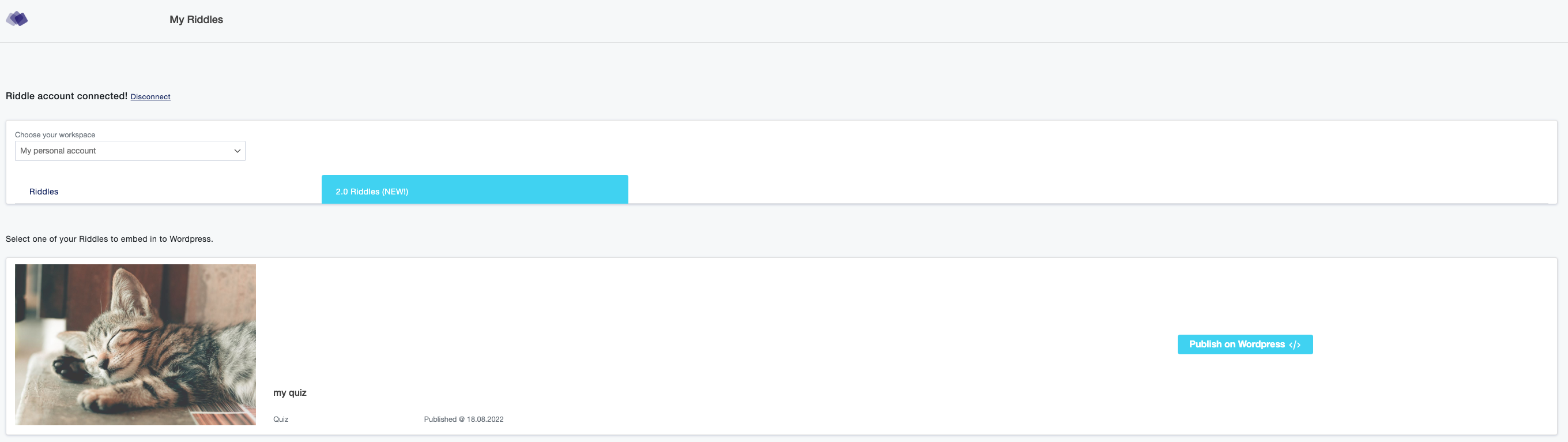 • Deprecated old Creator 1.0 API Access Tokens – now you need to reauthenticate to get Riddle shortcodes & embed new Riddles. (Existing embeds on WordPress pages will not be affected and still work with both API versions.)